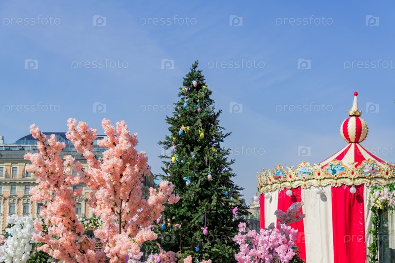 Украшение улиц на Пасху Московские пасхальные праздники. Цветущая сакура, ель с яйцами и красочная карусель