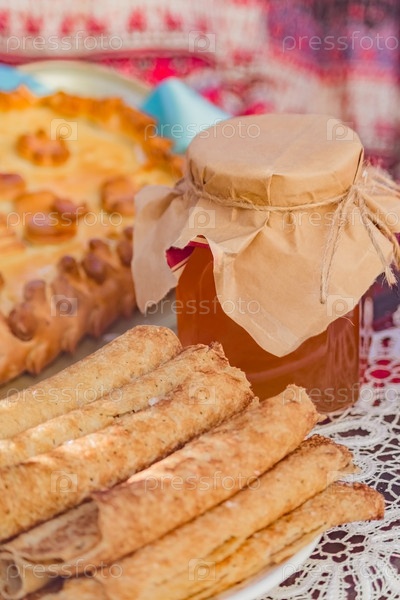 Вкусные блинчики и банка меда, крупным планом