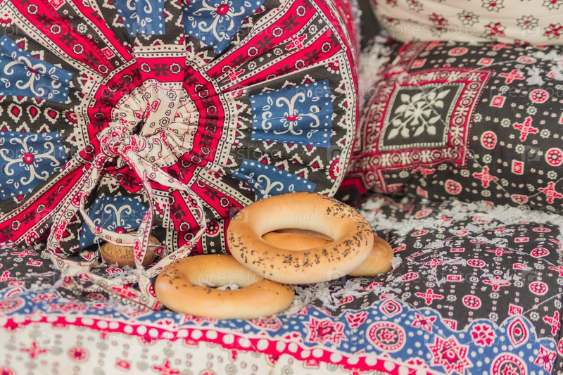 Русские традиционные угощения - рогалики на красочной скатерти. Национальный натюрморт