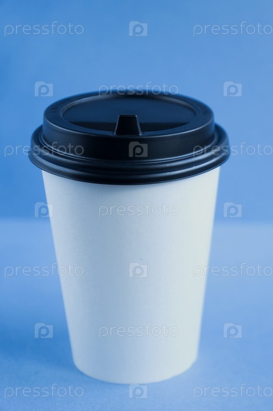 Белая бумажная крафтовая одноразовая чашка для кофе с черной пластиковой крышкой. кофе, чтобы пойти на синем фоне