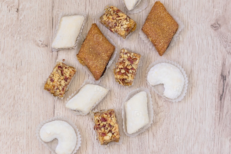 Традиционные рахат-лукумы на деревянном столе. Ассорти восточных сладостей. Вид сверху