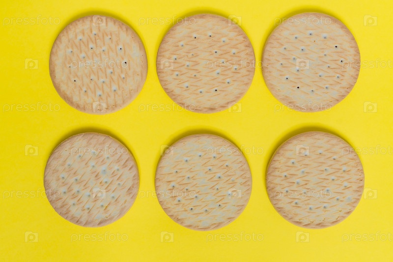 Вкусное круглое печенье на желтом фоне, вид сверху