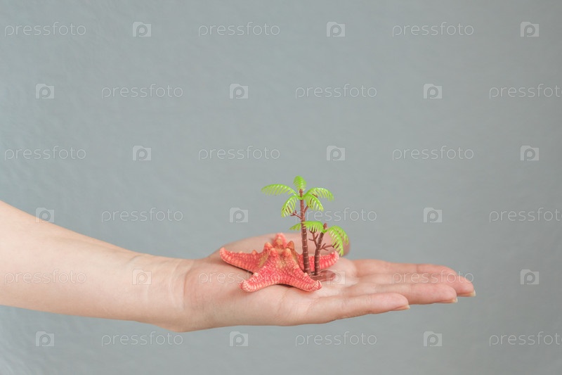 Морская звезда и пальма в руке женщины. Концепция путешествий и отдыха