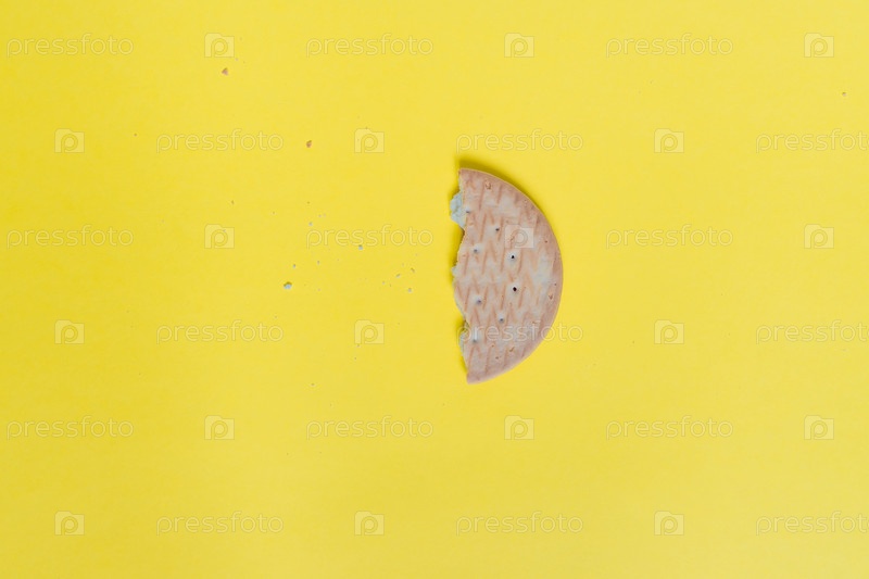 Вкусное круглое печенье на желтом фоне, вид сверху