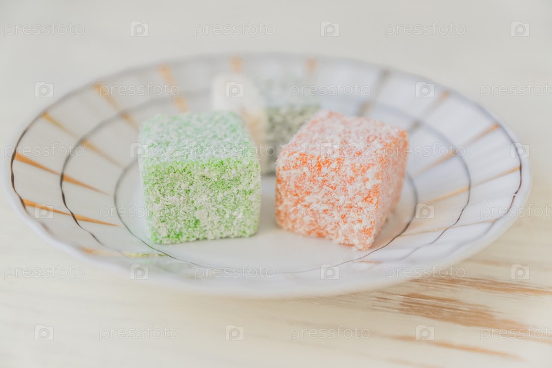 Традиционный рахат-лукум на тарелке на белом деревянном фоне. Ассорти восточных сладостей