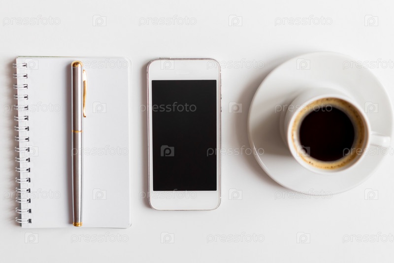 Вид сверху на белый офисный стол, смартфон, блокнот с металлической ручкой и чашкой черного кофе, бизнес-макет, плоская планировка