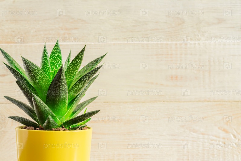 Крупный план растения алоэ вера в желтом керамическом горшке на деревянном фоне. Домашнее садоводство, место для копирования текста