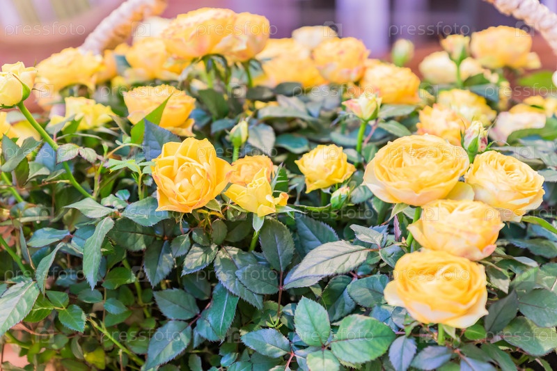 Желтые розы в плетеной корзине, поздравительная открытка, естественный фон