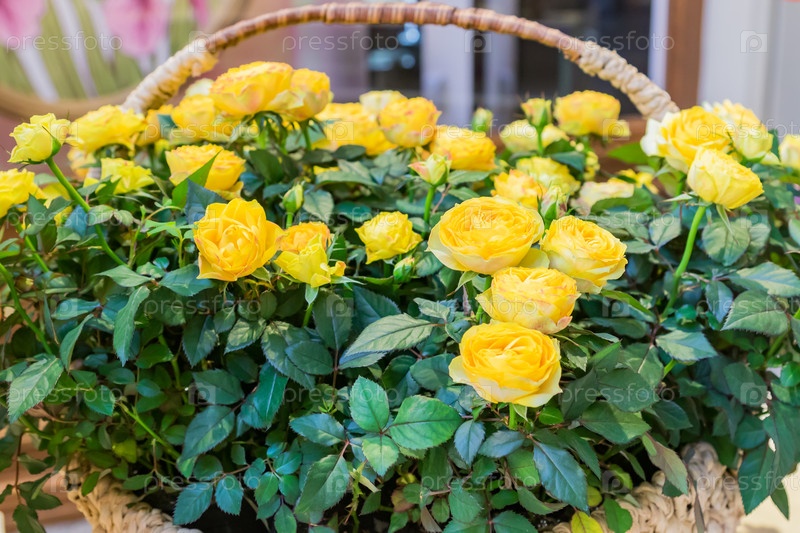 Желтые розы в плетеной корзине, поздравительная открытка, естественный фон
