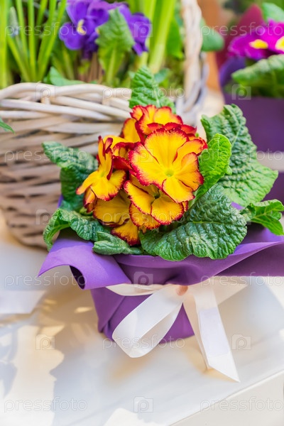 Желтый цветок первоцвета в праздничной упаковке для подарка. Домашнее растение