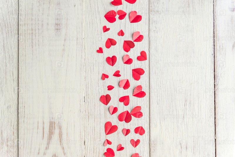 Много вырезанных бумажных красных сердечек на деревянном фоне, вид сверху, плоская планировка