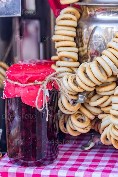 Традиционная русская церемония - чайный самовар, варенье и рогалики или баранка