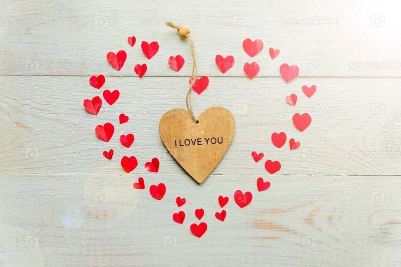 Большое красное сердце из вырезанных бумажных маленьких сердечек и деревянное сердце с надписью "Я люблю тебя" на деревянном фоне. Украшение своими руками на день святого Валентина