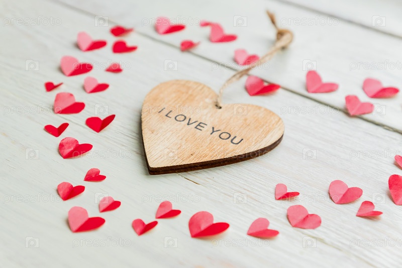 Большое красное сердце из вырезанных бумажных маленьких сердечек и деревянное сердце с надписью "Я люблю тебя" на деревянном фоне. Украшение своими руками на день святого Валентина