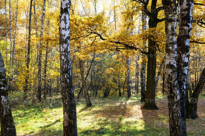 Вид на луг в осеннем лесу городского парка