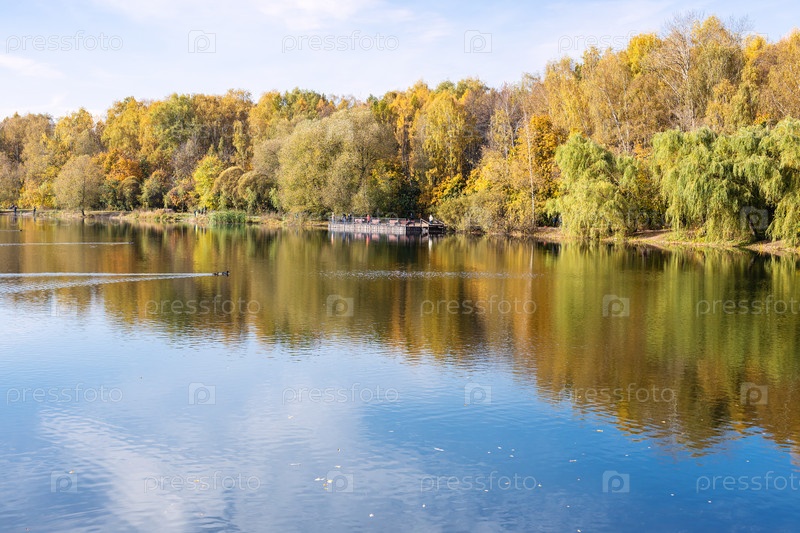 Вид на спокойный пруд в городском парке осенью