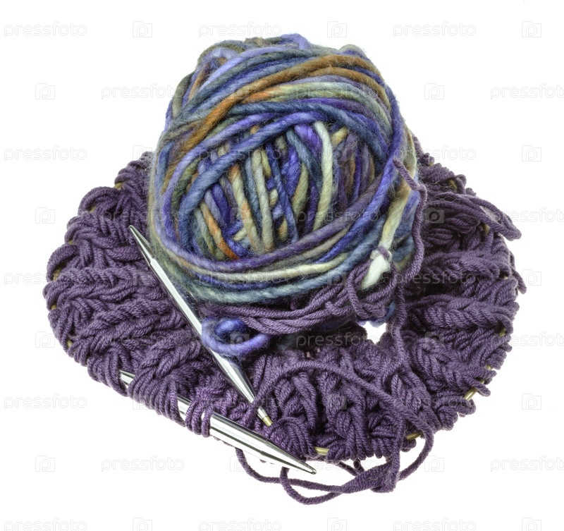 Вид сверху на клубок пряжи на вязаном шарфе-снуде