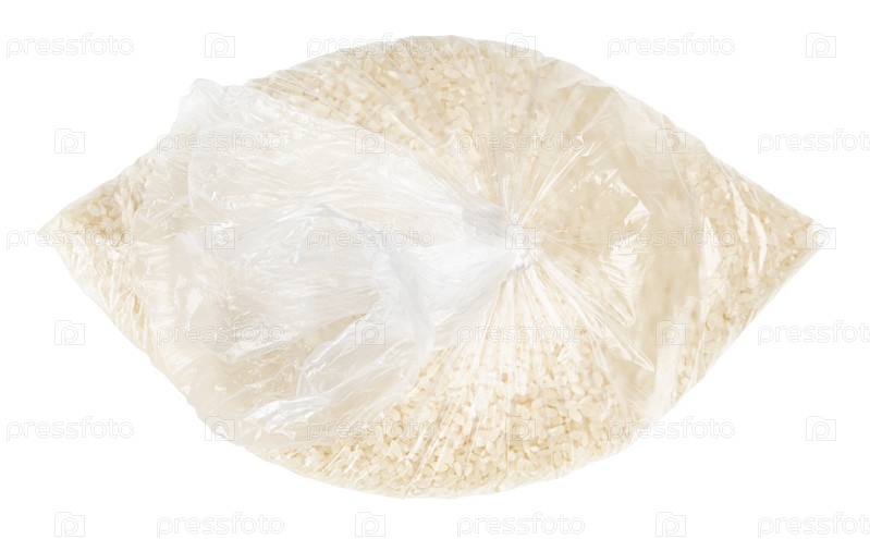 Сырой белый рис в завязанном полиэтиленовом пакете изолирован