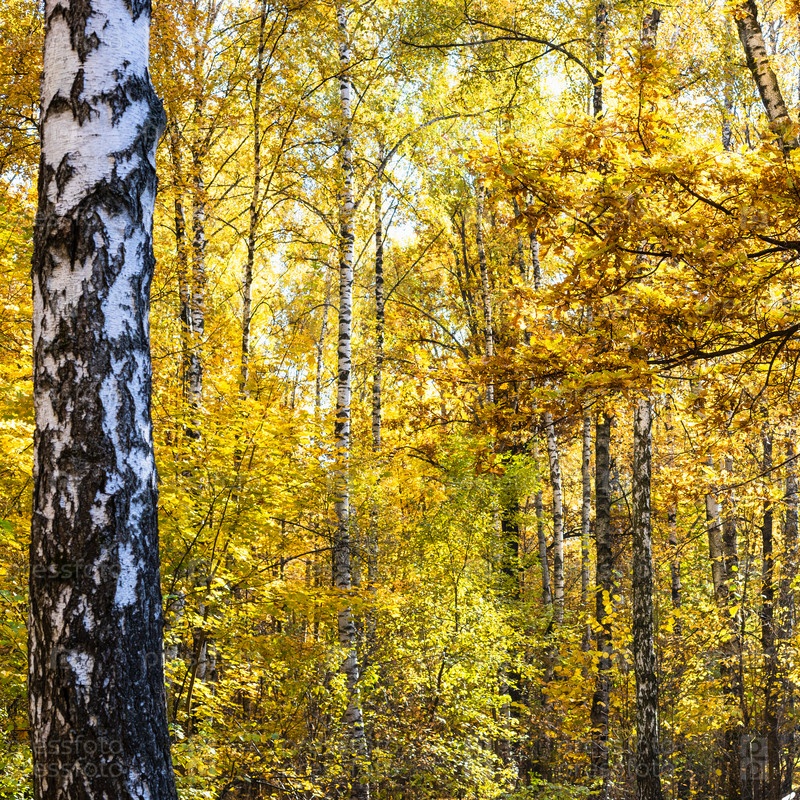 Листва дуба и березовой рощи в осеннем лесу