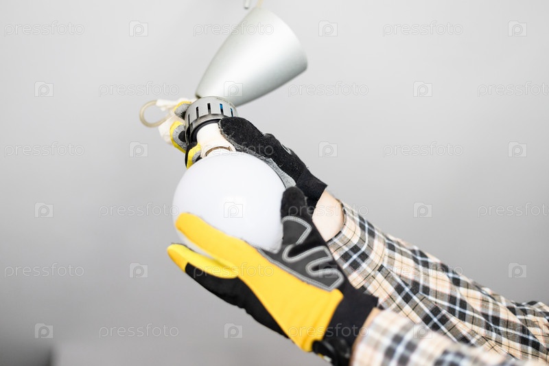 Электрик извлекает лампочку из неисправного потолочного светильника