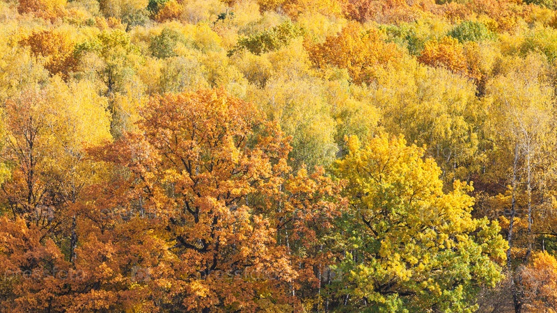 Панорамный вид с оранжевым дубом в желтом лесу