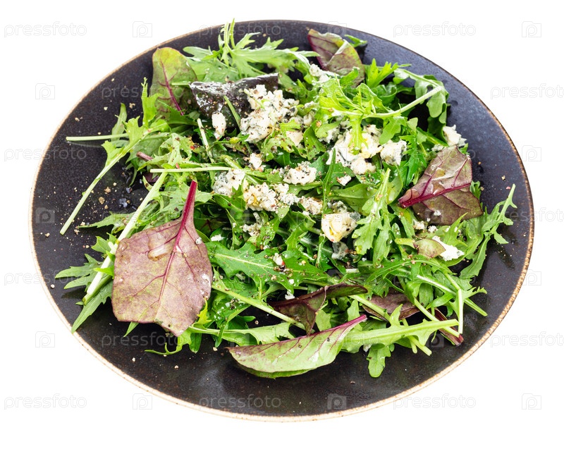 Зеленый салат с голубым сыром на изолированной тарелке