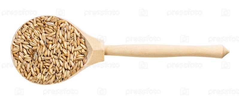 Вид сверху на деревянную ложку с неполированными зернами овса