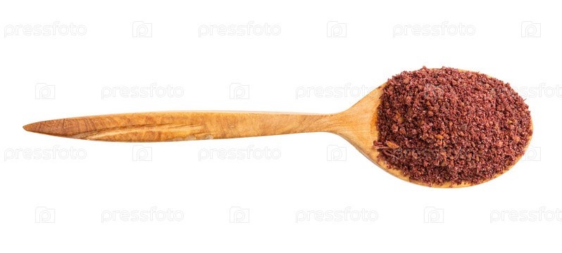 Вид сверху на деревянную ложку с изолированным молотым сумахом
