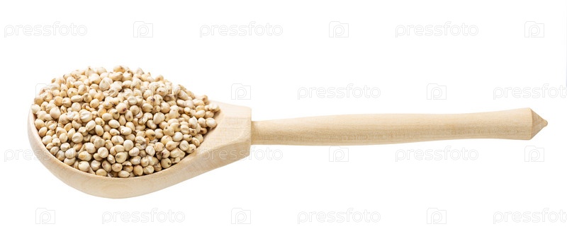 Сырые неполированные зерна сорго в деревянной ложке