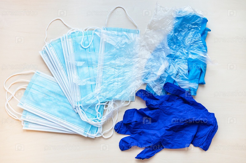 Вид сверху на одноразовые маски для лица и перчатки для рук