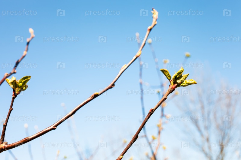 Веточки с почками дерева и голубое небо весной