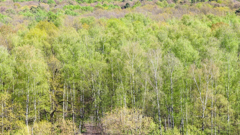 Панорамный вид на зеленые деревья в лесу весной