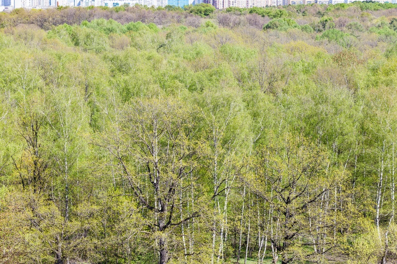 Над видом на городской парк с пышной зеленой листвой
