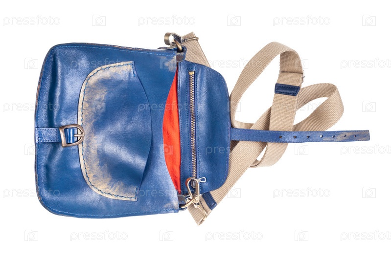 Открытая пустая синяя кожаная сумка с текстильным ремешком