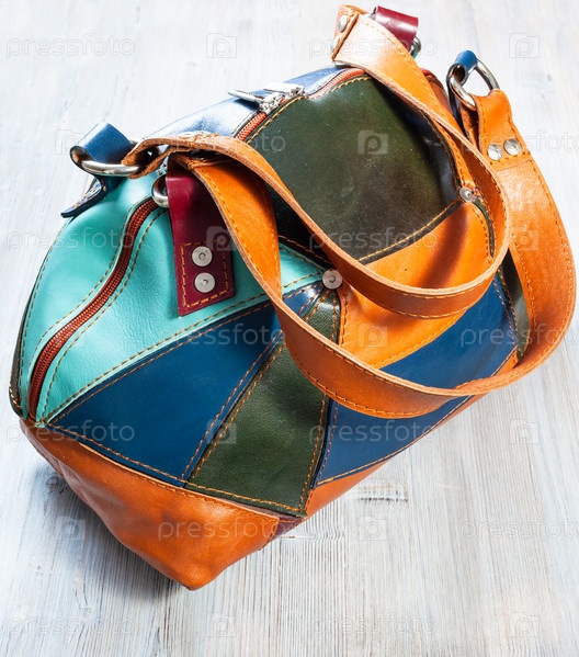 Лоскутная кожаная дорожная сумка на деревянном столе