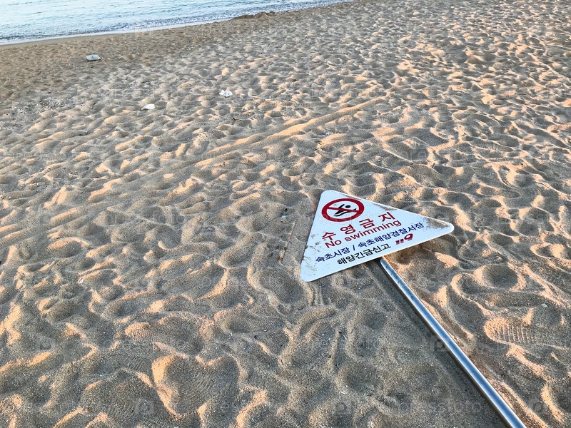 Знак запрета купания на песчаном пляже в городе Сокчо