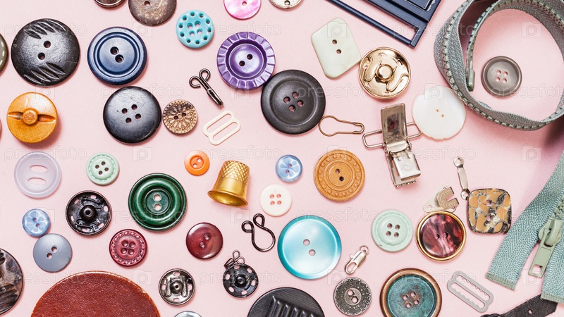 Много различных швейных предметов на розовом фоне