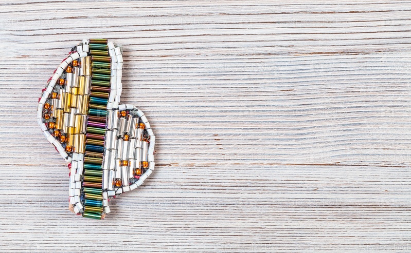 Брошь из различных стеклярусов и бусин на сером