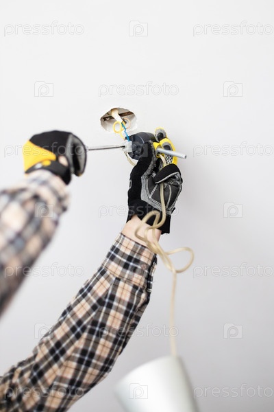 Электрик чинит электропроводку лампы