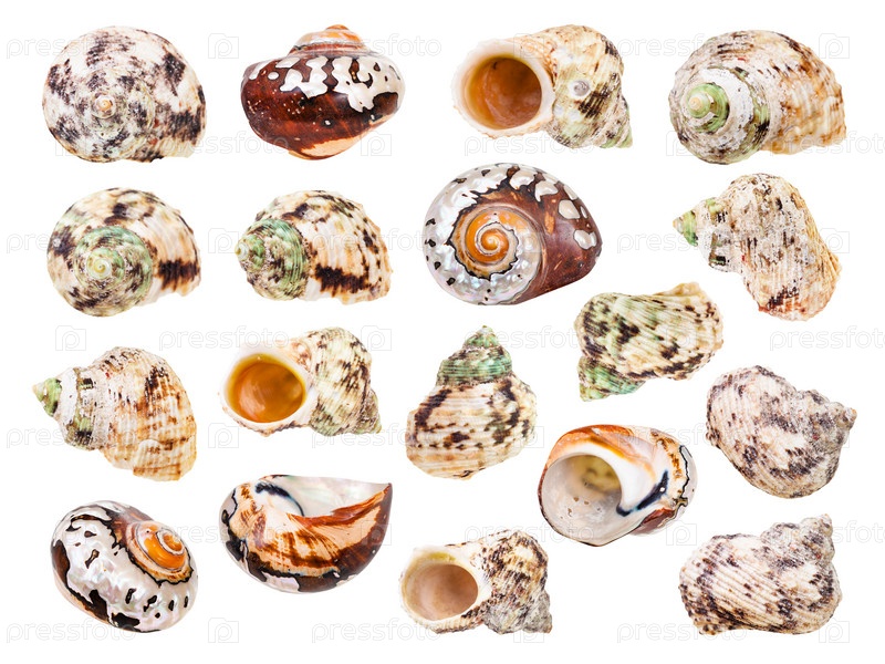 Набор морских раковин моллюсков, изолированных на белом