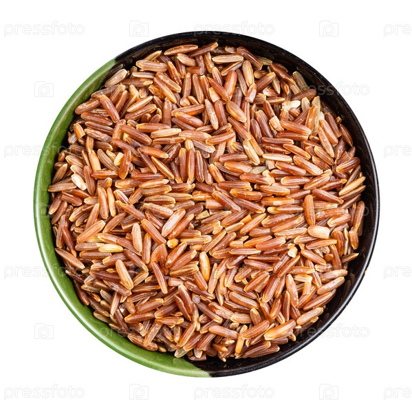 Вид сверху на сырой красный рис в круглой миске изолирован