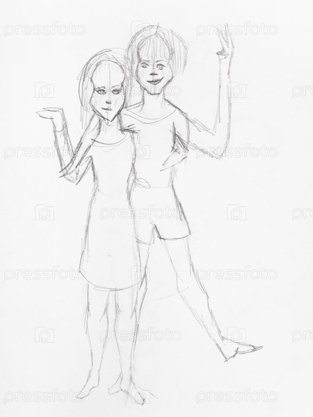 Эскиз счастливых девушек, нарисованный черным карандашом