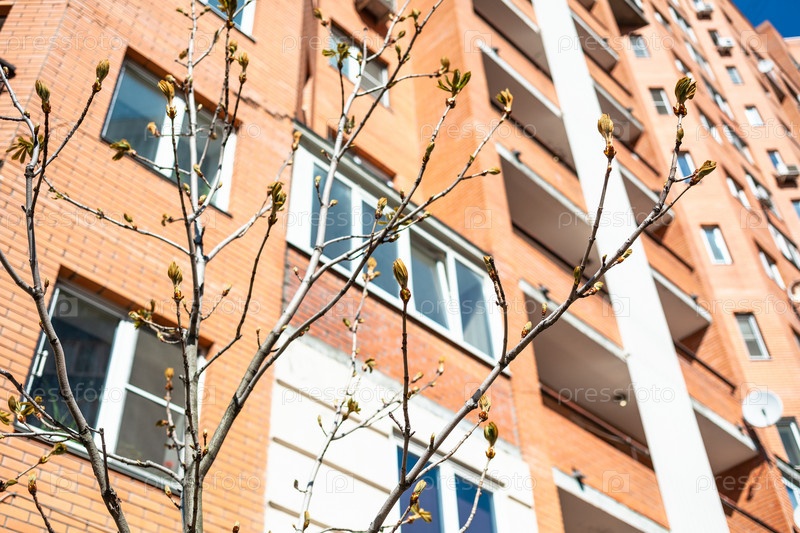 Веточки с почками и высотный жилой дом
