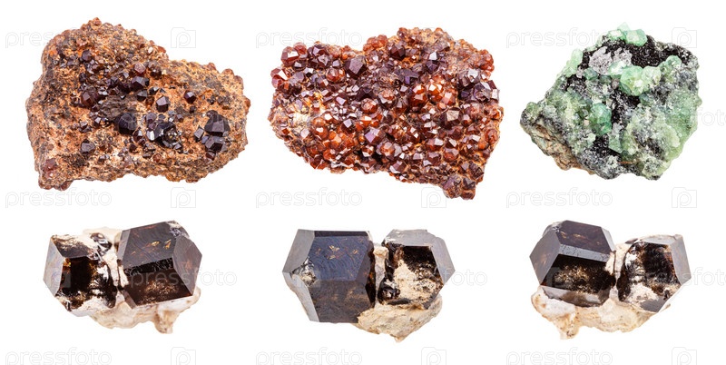 Набор различных изолированных кристаллов андрадитового граната