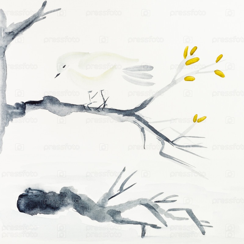 Птица на ветке дерева, нарисованная черной акварелью