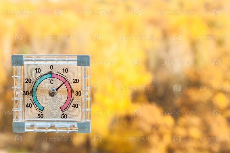 Термометр на окне и размытые желтые деревья