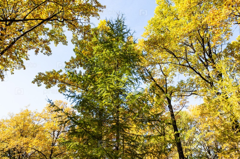 Кроны желтых дубов и зеленых лиственниц осенью