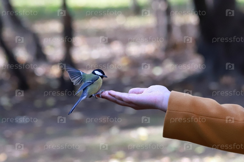 Осенняя синица кормится на женской руке