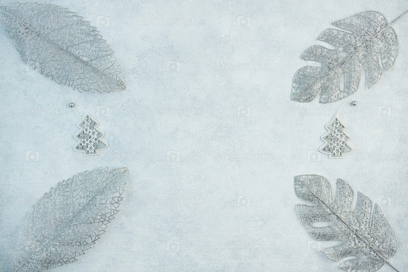 Концепция праздничного фона в серебристых тонах. Вид сверху на серебряные шарики из подарочной коробки на сером фоне. Макет фона новогодних праздников с местом для копирования