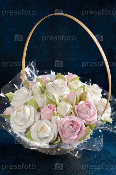 Зефирный букет цветов в подарочной корзине на синем фоне. концепция праздничного настроения